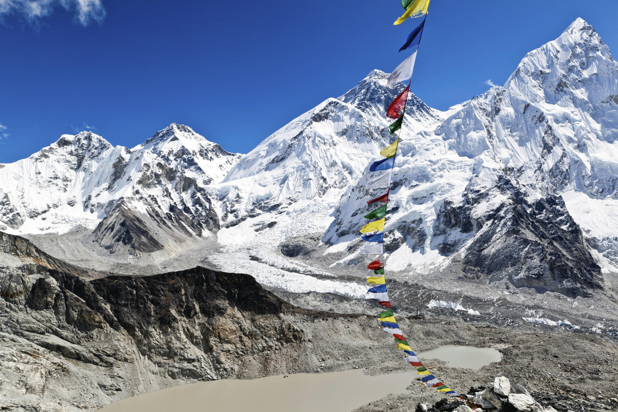mountains_329View of Mt. Everest Lhotse and Nuptse with prayer flags and tourists from Kala Patthar view point near Gorak Shep and Everest base camp, Khumbu valley, Sagarmatha national park, Nepal
