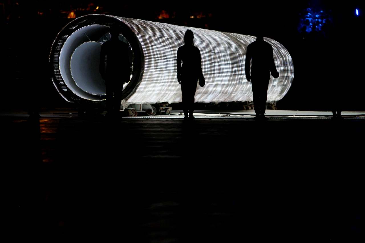 a troupe of female dancers dressed in Tang-era clothing entered, suspended by a rectangular extension held by hundreds of performers. On the
