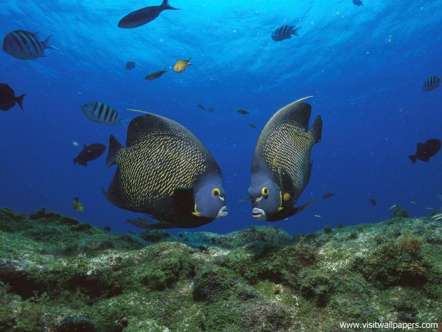 ocean-life-804Damselfish swim in shallow water in Palau's inner lagoon. Palau is known for its beautiful rock islands, prolific marine life, and world class scuba diving and snorkeling.