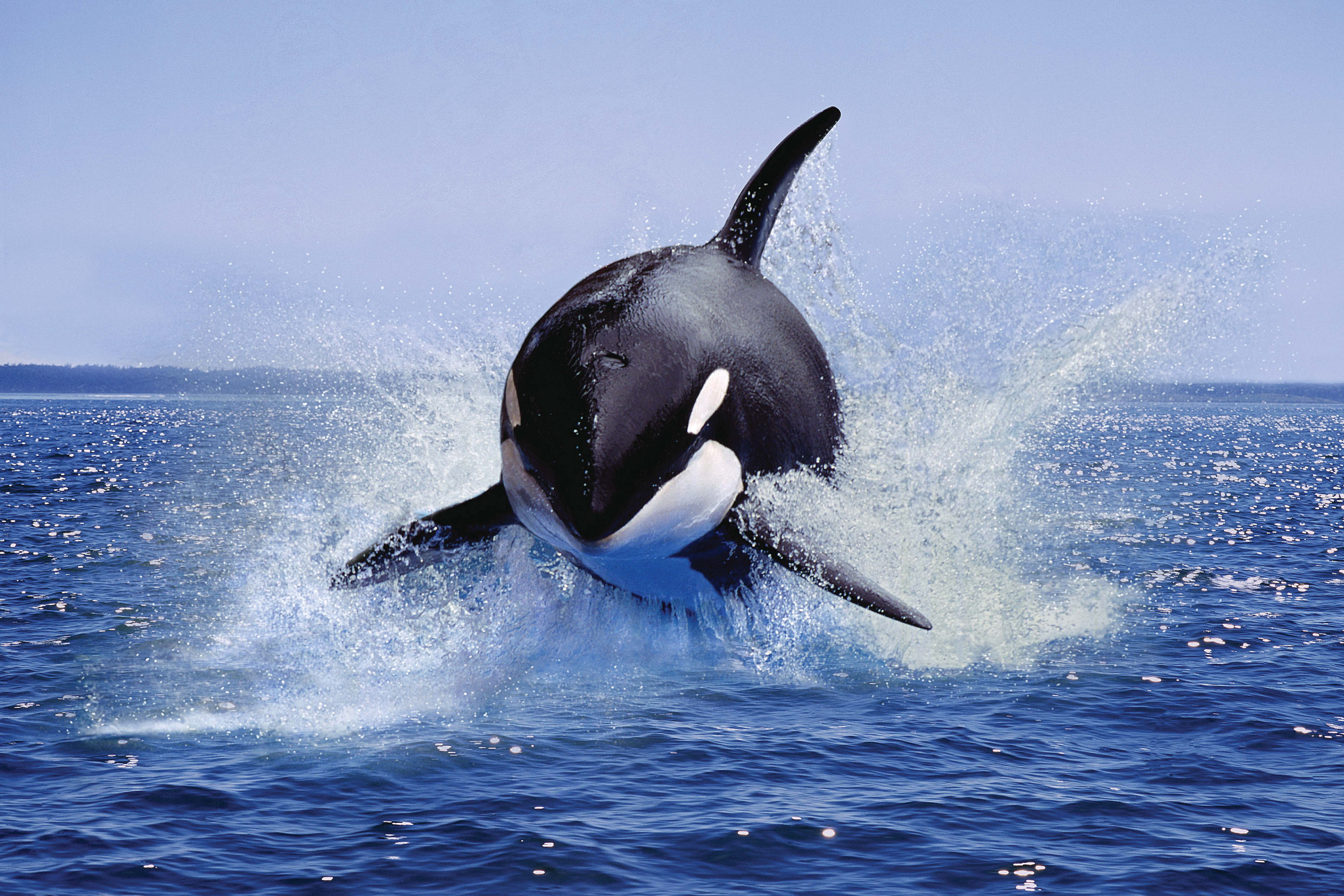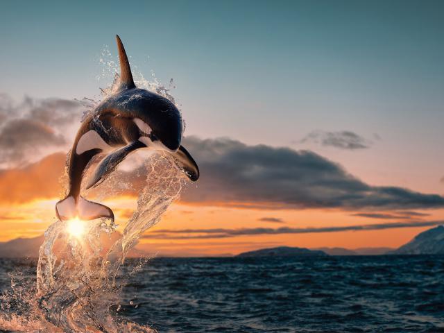 ocean-life-797Killer whale, known as Orca, jumping out of sunset ocean water with splashes, Norwegian fjord in the background