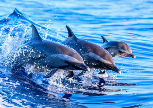 Four beautiful dolphins jumping over waves. Hawaiian Pacific Ocean wildlife scenery. Marine animals in their natural habitat.