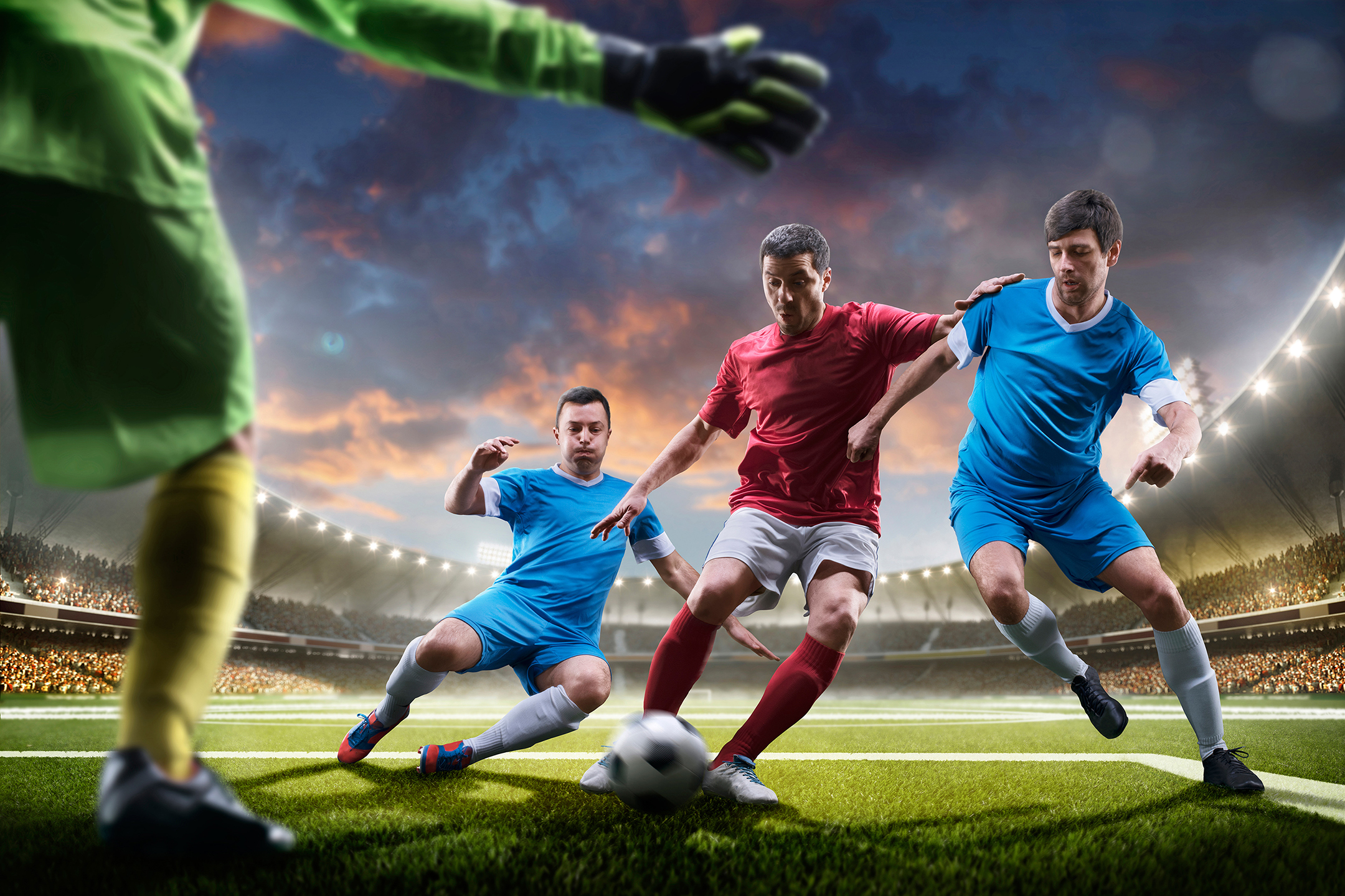 soccer_70 Three soccer players fight for a ball. Tough competition. Slide tackle. Soccer stadium (3D render) Date: 9/13/2023 Three soccer players fight for a ball. Tough competition. Slide tackle. Soccer stadium (3D render)