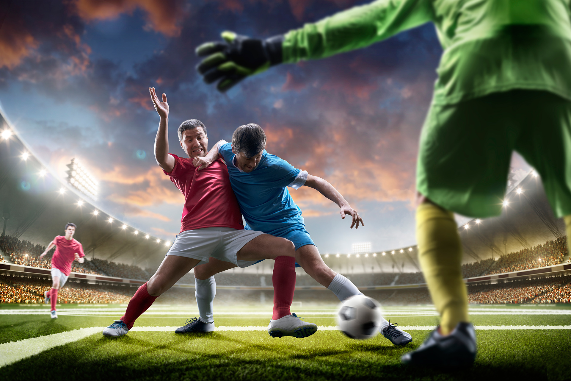 soccer_52 Soccer scene with competing soccer players in the stadium. 3d rendering Date: 12/27/2022 Soccer scene with competing soccer players in the stadium. 3d rendering