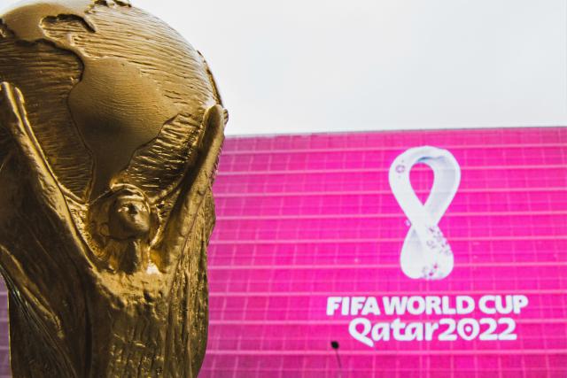 worldcup_2022_15 Copy of world cup trophy on background logo of the FIFA world Cup 2022, which will be held in Qatar from 21 November to 18 December 2022, on a giant screen in the city center.The 2022 FIFA World Cup is scheduled to be the 22nd running of the FIFA Worl Date: 9/4/2019 Copy of world cup trophy on background logo of the FIFA world Cup 2022, which will be held in Qatar from 21 November to 18 December 2022, on a giant screen in the city center.