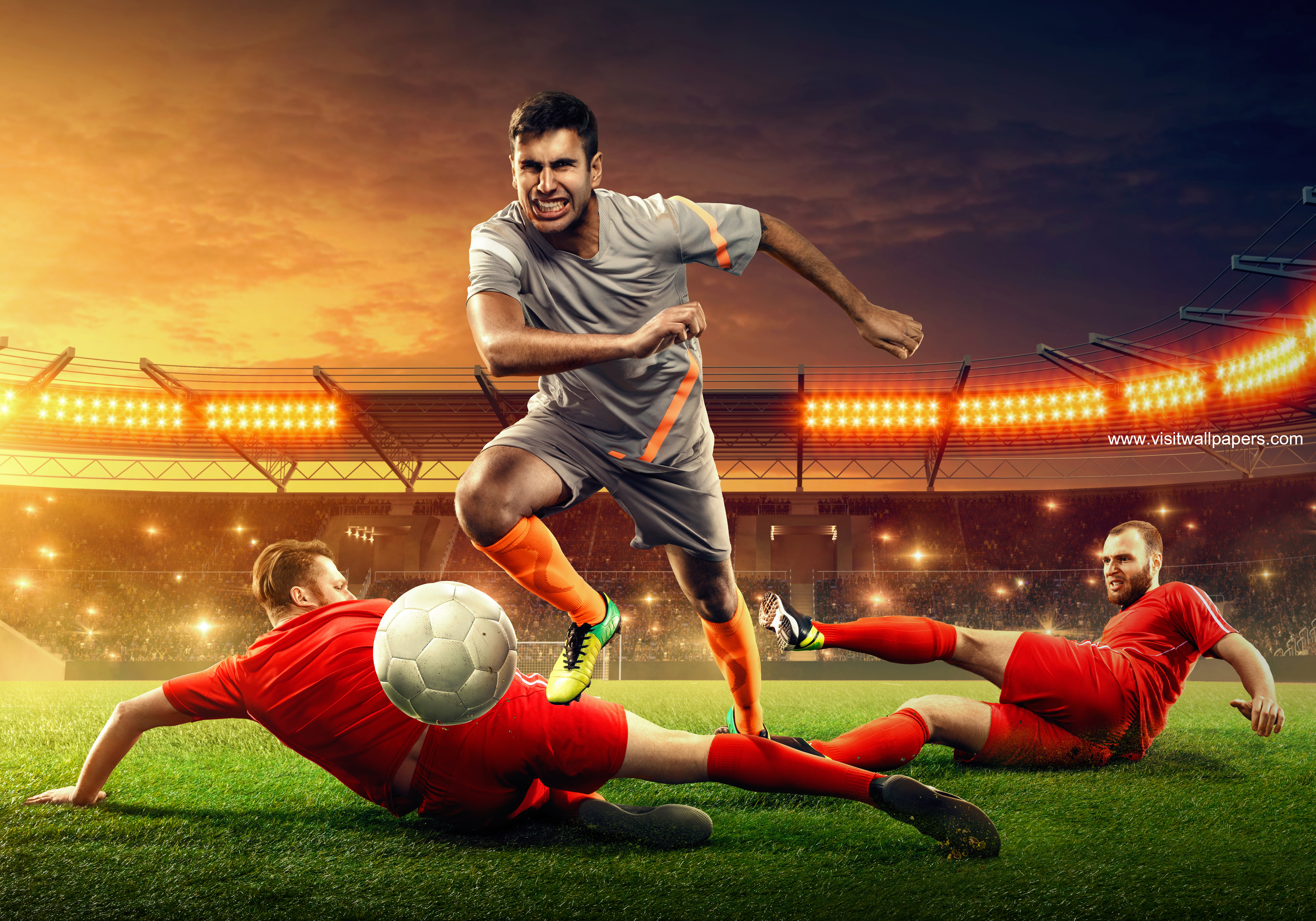 soccer_69 Three soccer players fight for a ball. Tough competition. Slide tackle. Soccer stadium (3D render) Date: 9/13/2023 Three soccer players fight for a ball. Tough competition. Slide tackle. Soccer stadium (3D render)