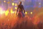 Fantasy_391 knight warrior standing with sword in field, illustration painting Date: 6/8/2023 knight warrior standing with sword in field, illustration painting