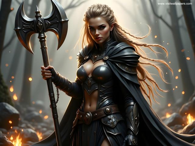 Fantasy_440 A beautiful, and strong barbarian woman with long, braided blond hair, muscular muscles, and light battle scars, sweating slightly in light black, open-belted leather armor with a belt, buckles, and straps, and a bearskin cloak. She holds a large, giant, Date: 3/29/2025 A beautiful, and strong barbarian woman with long, braided blond hair, muscular muscles, and light battle scars, sweating slightly in light black, open-belted leather armor with a belt, buckles, and straps, and a bearskin cloak. She holds a large, giant, massive, two-handed battle axe.