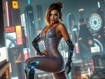 Fantasy_430Futuristic woman, wearing a form-fitting glossy black latex catsuit, highly reflective surface catching city lights, standing in a dynamic organic pose against a cyberpunk urban environment, neon signs and skyscraper