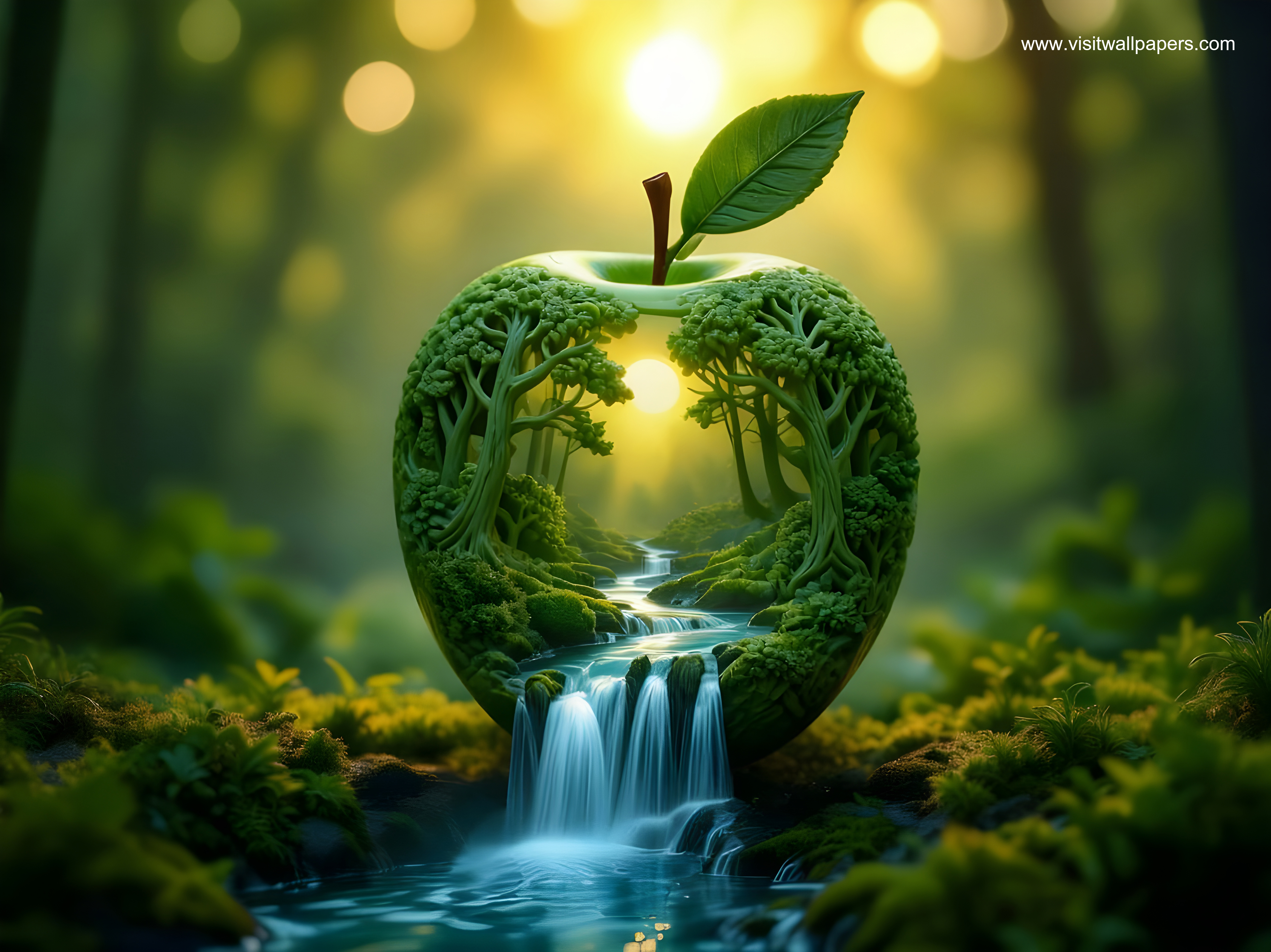 green_082Surreal green apple double exposure with sunshine and waterfall. The apple is styled with a detailed landscape scene carved into its surface, depicting a river setting with lush green trees in the background.