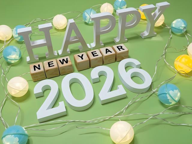 Happy New Year 2026 alphabet letter with LED cotton balls on green background.