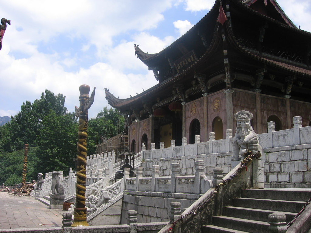 There are paintings inside the temple depicting Ksitigarbha. In the Tiger Tower, there are paintings of twelve Magi and the Jade Emperor's thirty palaces as well as paintings of Confucius. The towers have a double spiral staircase, one each for ascending and descending visitors.