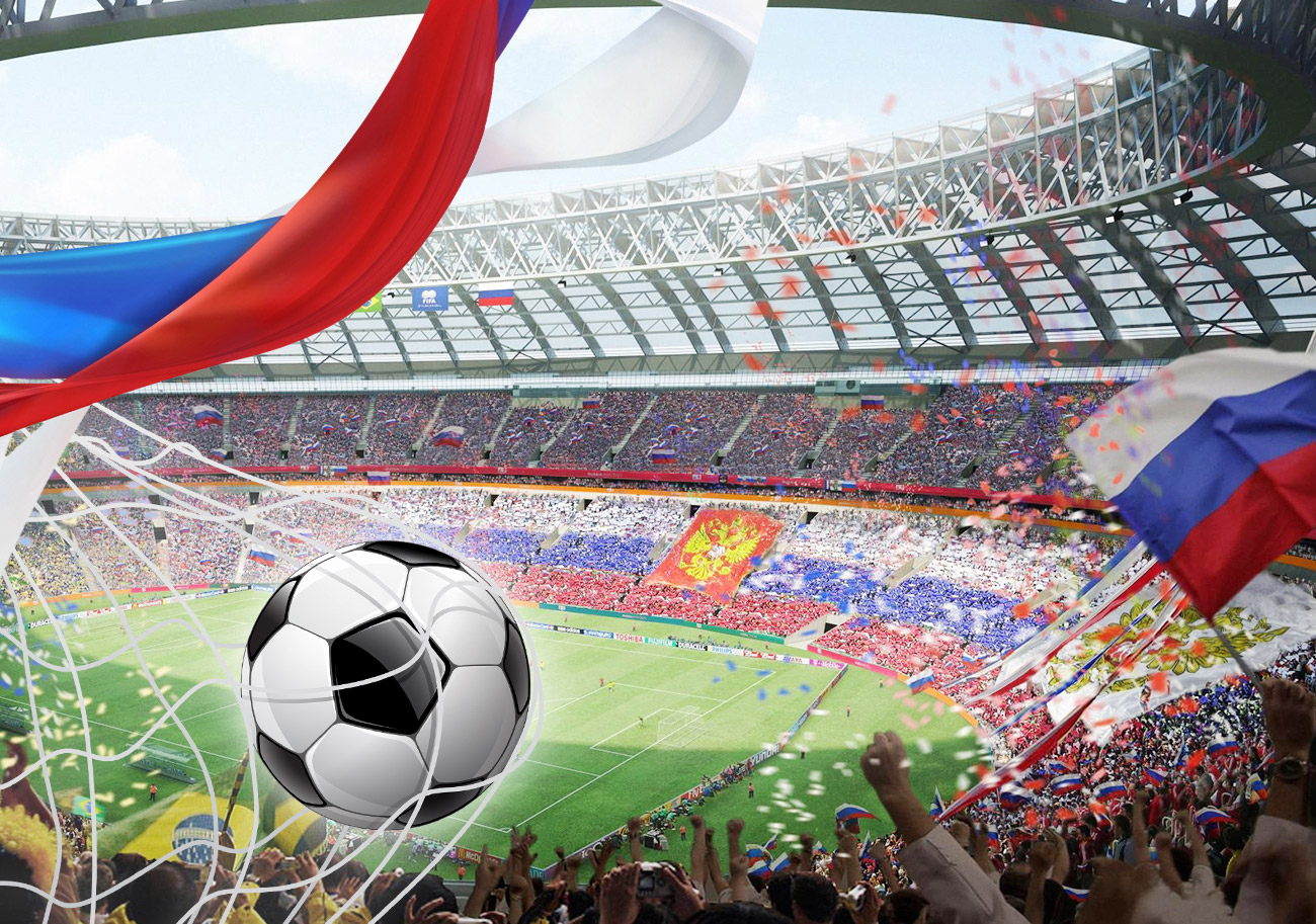 Soccer concept. White soccer ball with the flag in the stadium, 2022. 3d render