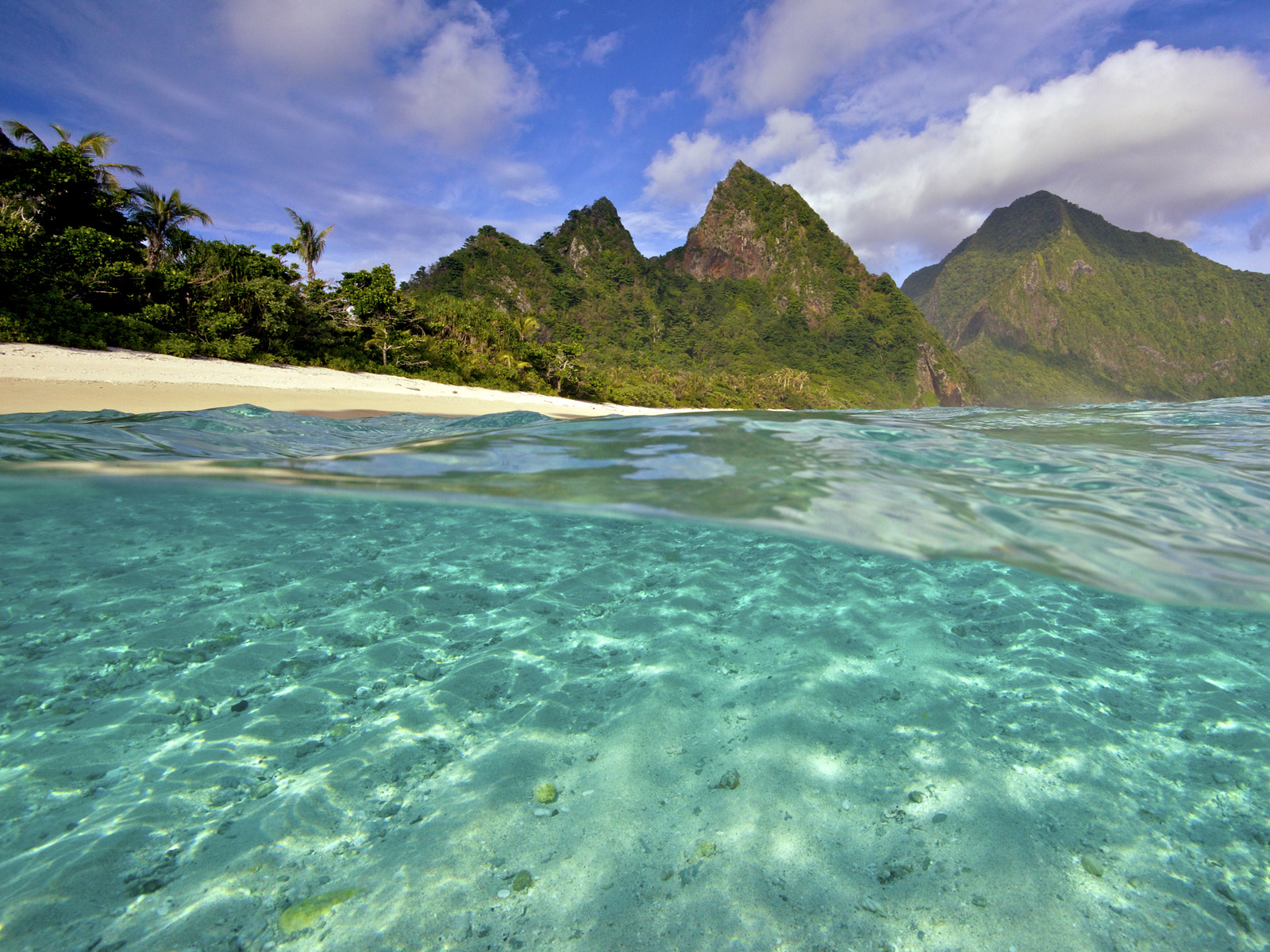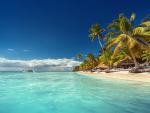 Beaches_170Palm trees over white beach on Plantation Island, Fiji, South Pacific