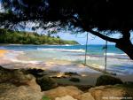 Beaches_176Tropical beach background as summer landscape with beach swing or hammock and white sand and calm sea for beach banner. Perfect beach scene vacation and summer vacation concept. Increase the color process.