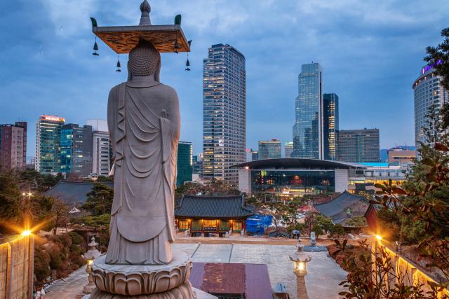 A forgotten city hidden deep within a mist-shrouded jungle, its crumbling stone temples overtaken by vines and moss. Towering statues of ancient buddha.