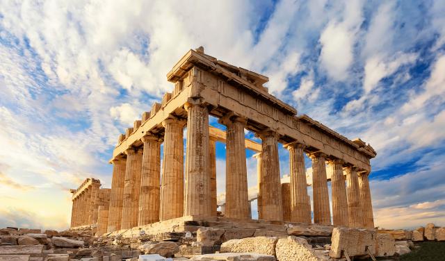 Low angle view of Parthenon's columns at sunset, Acropolis, Athens.