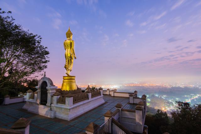 Nan province Wat Phrathat Khao Noi with Sunrise and the mist. This temple is the best location view of Nan province, Thailand
