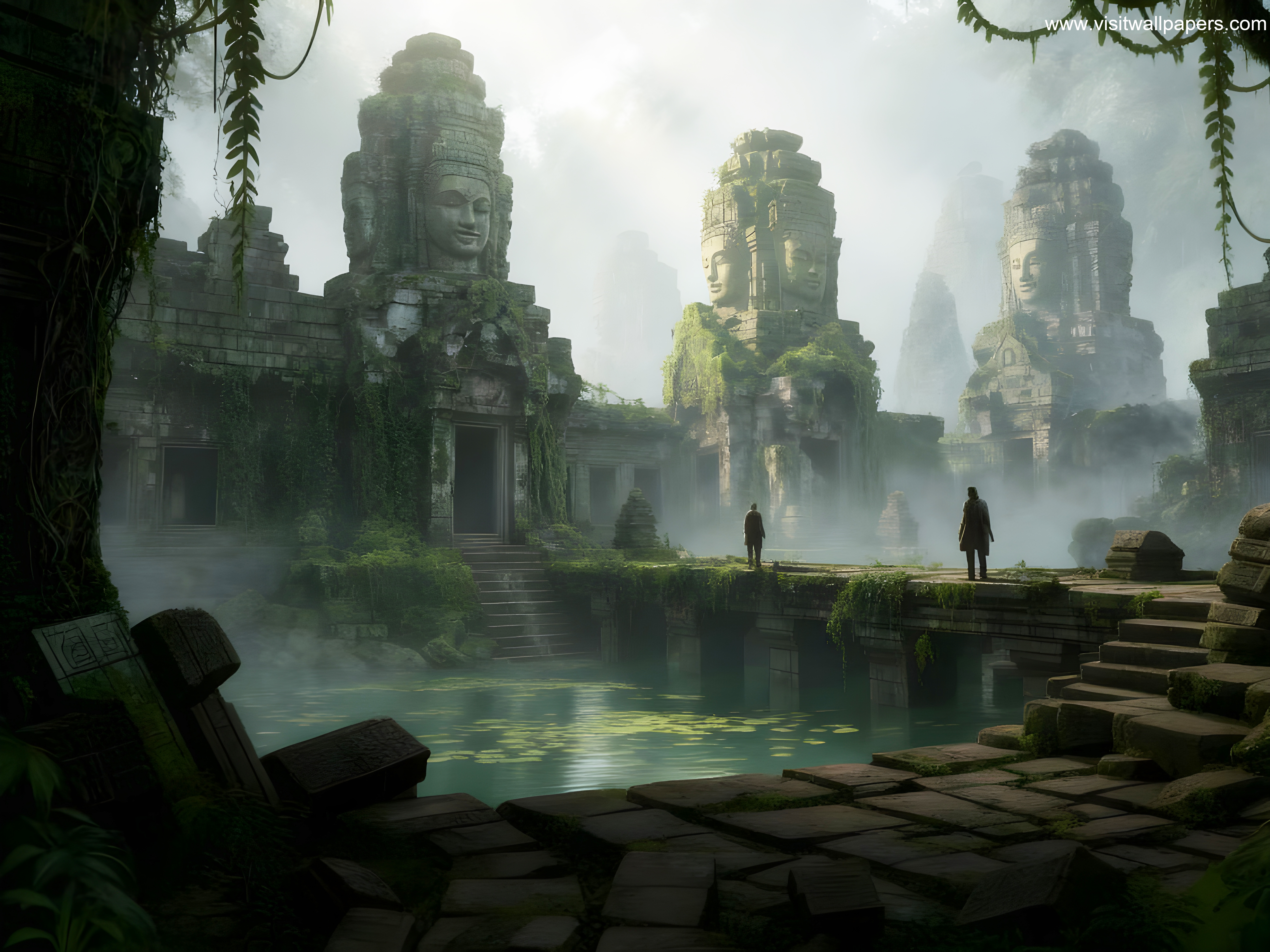 temple_445A forgotten city hidden deep within a mist-shrouded jungle, its crumbling stone temples overtaken by vines and moss. Towering statues of ancient buddha.