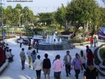 The scenic park with fountains and cactuses in pots in front of Sahaba mosque, located in Old Town, Sharm El Sheikh, Egypt