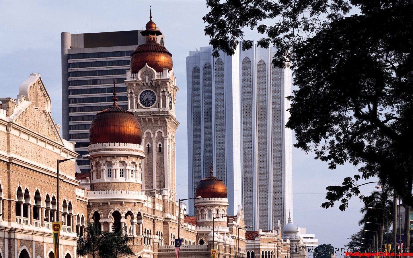Both towers are seven storeys tall and have yellow walls, red pillars and orange tiles. A zigzag bridge connects the towers to the shore.