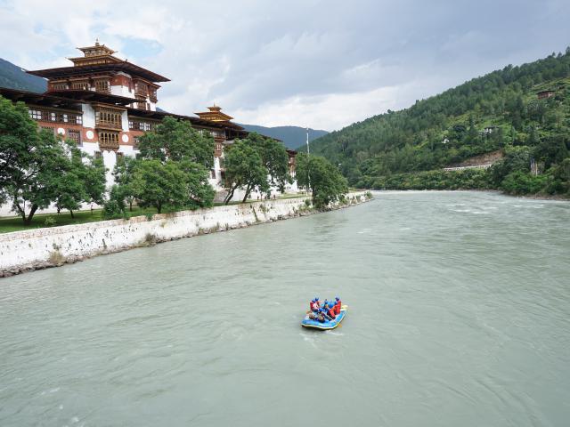bhutan_19A group of adventurers travels through a river in front of the Punakha Dzong using an Inflatable boat in the evening with cloudy sky.