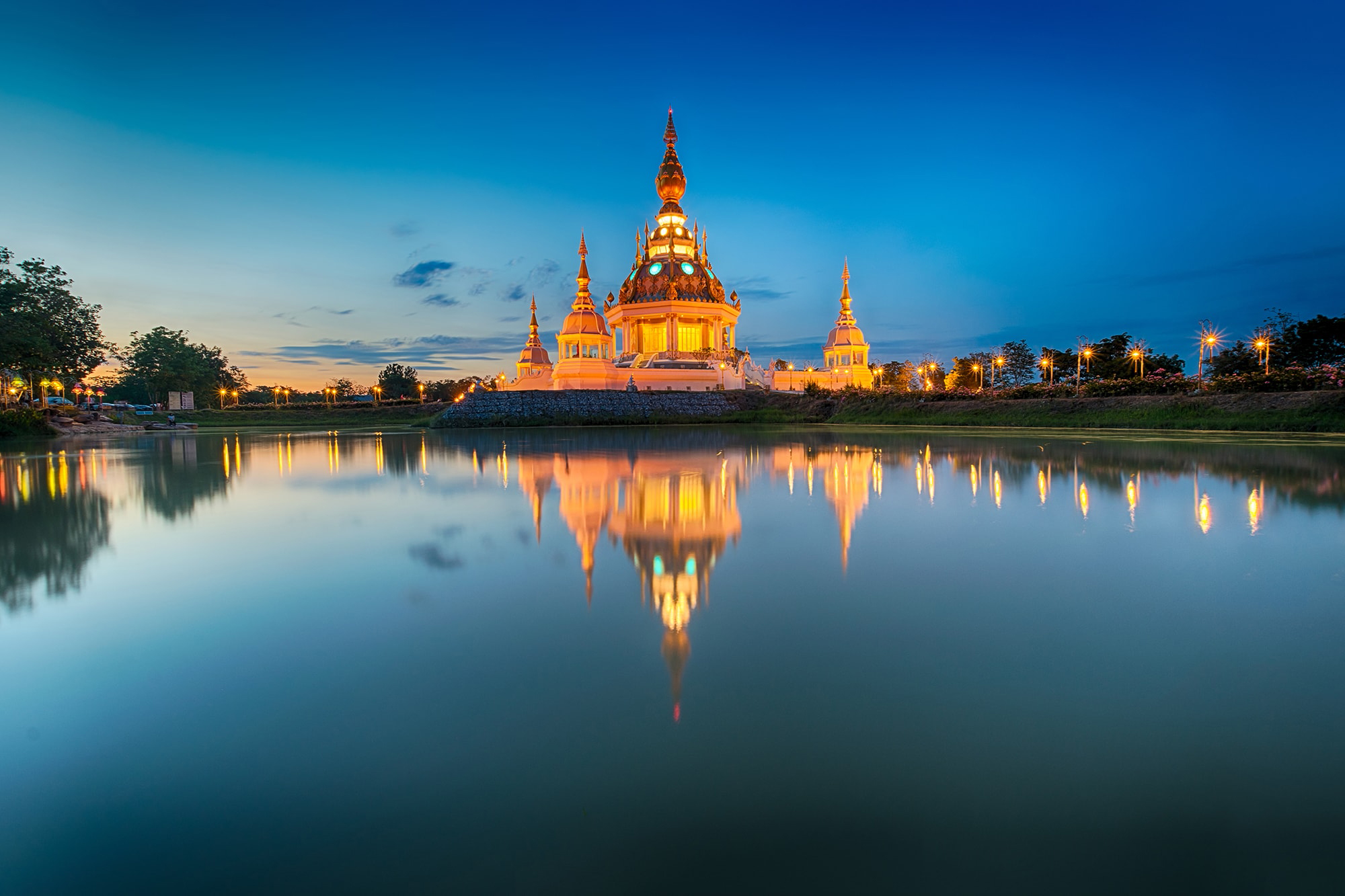 temple_421In Khon kaen twilight time at Bueng Kaen nakhon with Wat Phra Mahathat Kaen Nakhon, travel concept, lifestyle with copy space. Phra Mahathat Kaen Nakhon (Wat Nong Wang) (พระมหาธาตุแก่นนคร) วัดหนองแวง (จังหวัดขอนแก่น) วัดหนองแวง เป็นพระอารามหล