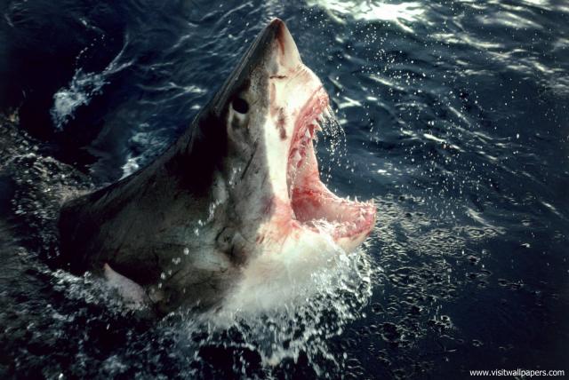 ocean-life-816Ocean shark bottom view from below. Open toothy dangerous mouth with many teeth. Underwater blue sea waves clear water shark swims forward