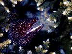 As the name suggests, the giant moray is a large eel, reaching up to 3 m (9.8 ft) in length and 30 kg (66 lb) in weight. Its elongated body is brownish in color. While juveniles are tan in color with large black spots, adults have black specks that grade into leopard-like spots behind the head.