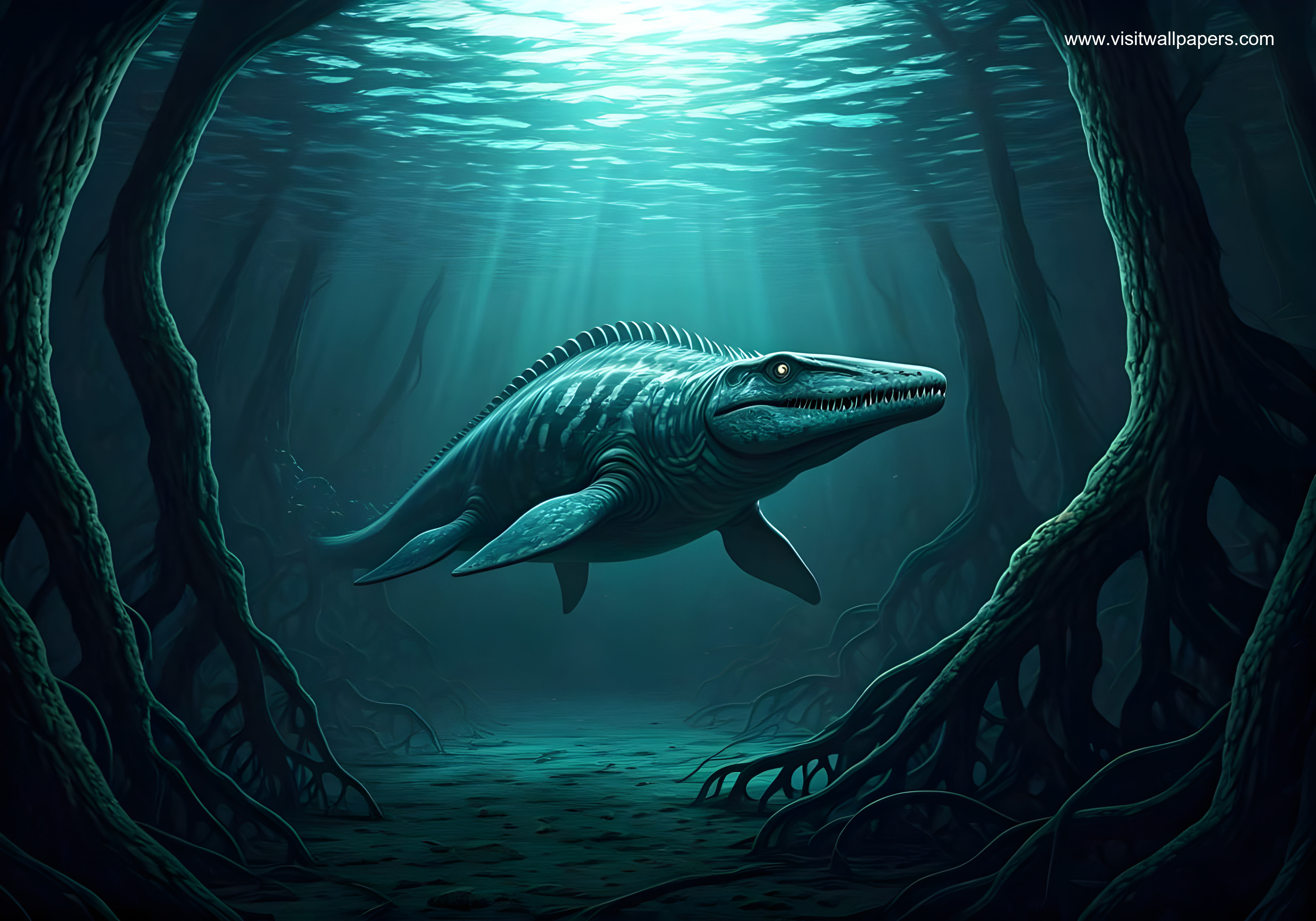ocean-life-829Mosasaurus with bulky skull and muscular build, jaws agape, poised to snap up a shark, glides through dark, alien ocean depths, bioluminescent eyes glowing, surrounded by shimmering turquoise water and eerie and twisted tree roots.