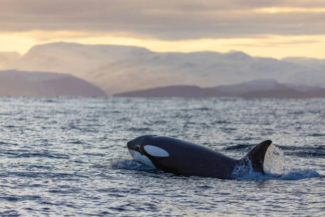 ocean-life-797Killer whale, known as Orca, jumping out of sunset ocean water with splashes, Norwegian fjord in the background
