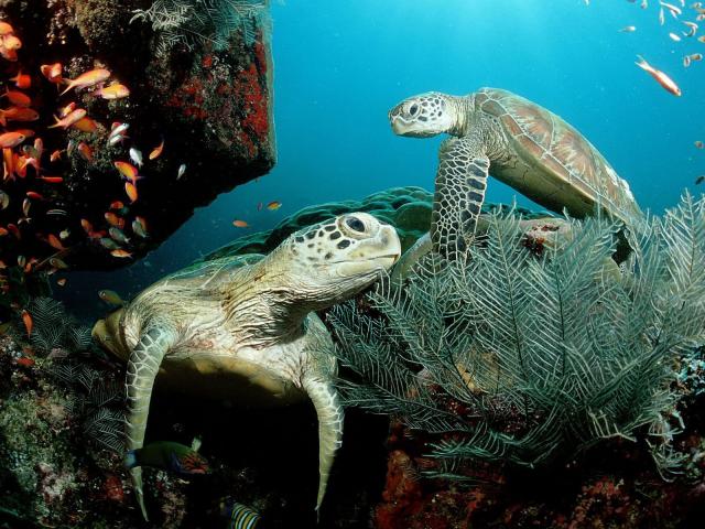 ocean-life-786Endangered hawaii Green sea turtles sail in the warm waters of the Pacific Ocean in Hawaii.