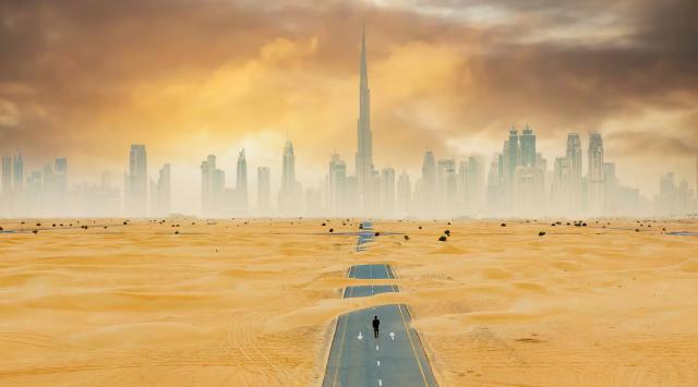 Dubai_125View from above, stunning aerial view of an unidentified person walking on a deserted road covered by sand dunes with the Dubai Skyline in the background. Dubai, United Arab Emirates.