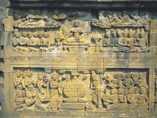 Built between 778 and 850 AD during the reign of the Sailendra Dynasty, the temple design follows Javanese Buddhist architecture, which blends the Indonesian indigenous tradition of ancestor worship and the Buddhist concept of attaining nirvāṇa. The temple demonstrates the influences of Gupta art that reflects India's influence on the region, yet there are enough indigenous scenes and elements incorporated to make Borobudur uniquely Indonesian. The monument is a shrine to the Buddha and a place for Buddhist pilgrimage. The pilgrim journey begins at the base of the monument and follows a path around the monument, ascending to the top through three levels symbolic of Buddhist cosmology: Kāmadhātu (the world of desire), Rūpadhātu (the world of forms) and Arūpadhātu (the world of formlessness). The monument guides pilgrims through an extensive system of stairways and corridors with 1,460 narrative relief panels on the walls and the balustrades. Borobudur has one of the largest and most complete ensembles of Buddhist reliefs in the world.