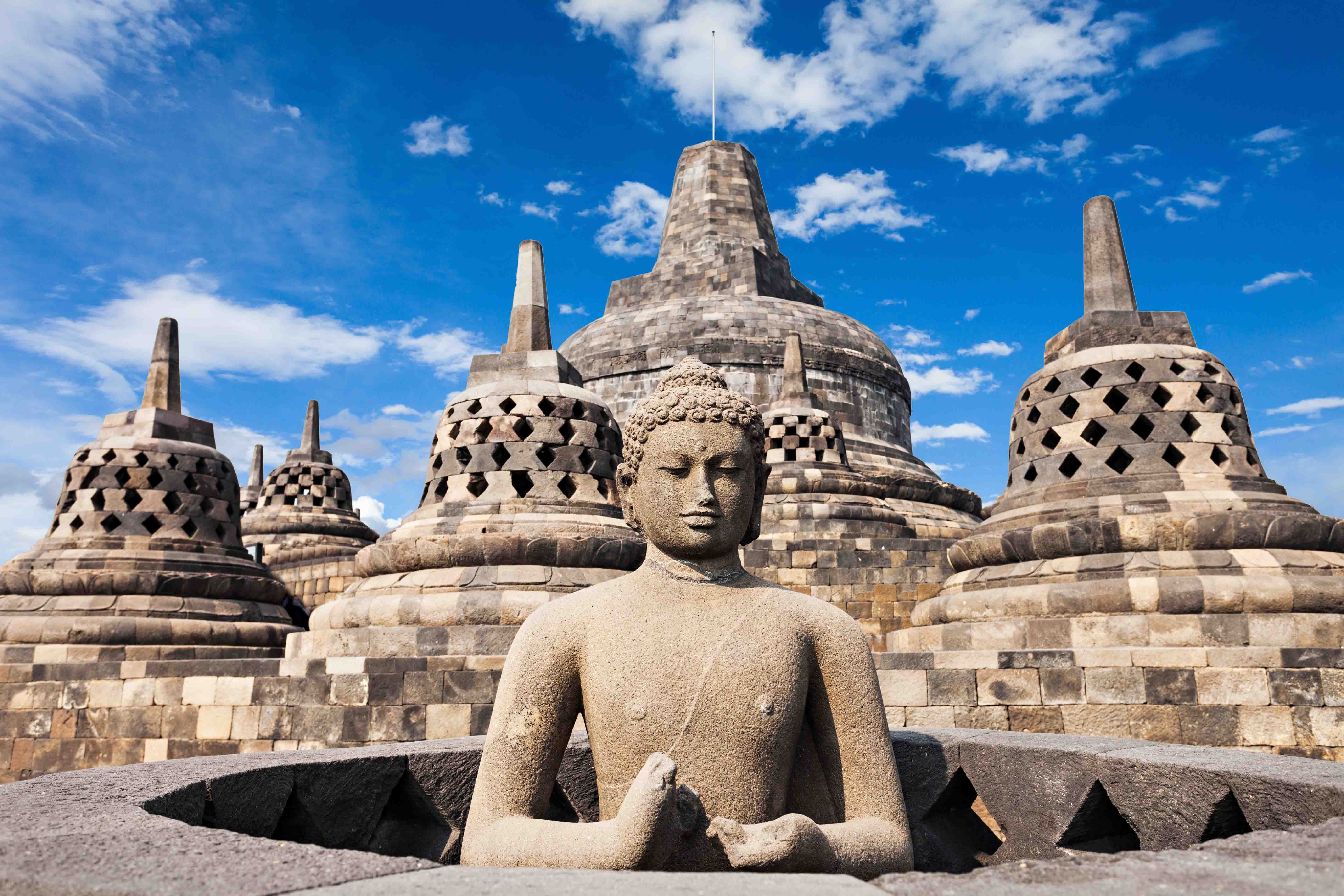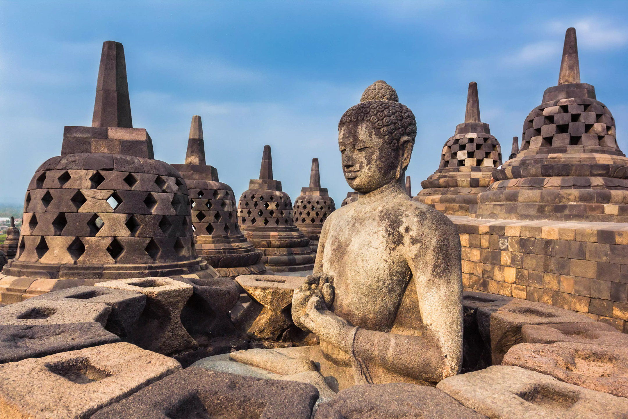 Indonesia_164 Amazing view of ancient Borobudur Buddhist temple with meditating Buddha statue carved from dark stone against blue sky on background. Great religious architecture. Magelang, Central Java, Indonesia Date: 5/1/2022 Amazing view of ancient Borobudur Buddhist temple with meditating Buddha statue carved from dark stone against blue sky on background. Great religious architecture. Magelang, Central Java, Indonesia