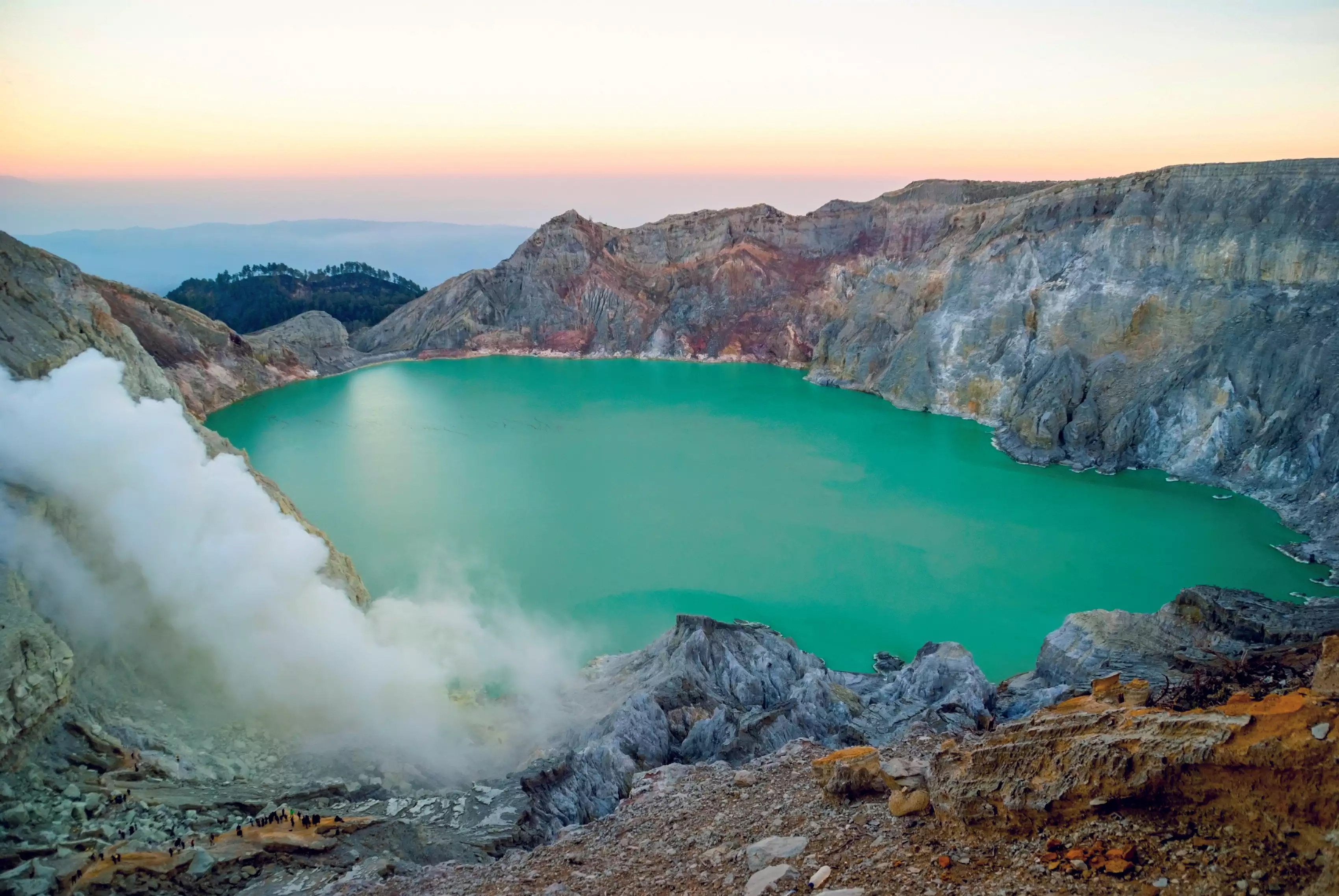 Indonesia_196 Mount ijen volcanic crater at sunrise with sulfur fog Date: 10/17/2023 Mount ijen volcanic crater at sunrise with sulfur fog