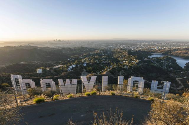 usa_459 HOLLYWOOD, CALIFORNIA - October, 31: Sunrise city view from hilltop behind the famous Hollywood sign in Griffith Park, on October 31, 2013 in Los Angeles, California. Date: 6/9/2024 HOLLYWOOD, CALIFORNIA - October, 31: Sunrise city view from hilltop behind the famous Hollywood sign in Griffith Park, on October 31, 2013 in Los Angeles, California.