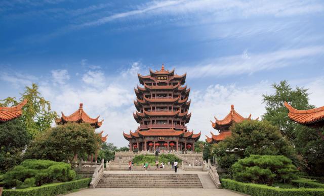 china_902Aerial view of Wuhan city. Panoramic skyline and buildings beside yangtze river. The yellow crane tower, located on snake hill in Wuhan, is one of the three famous towers south of yangtze river, China. 4 Chinese letters on tower is "Nang Xiong Gao