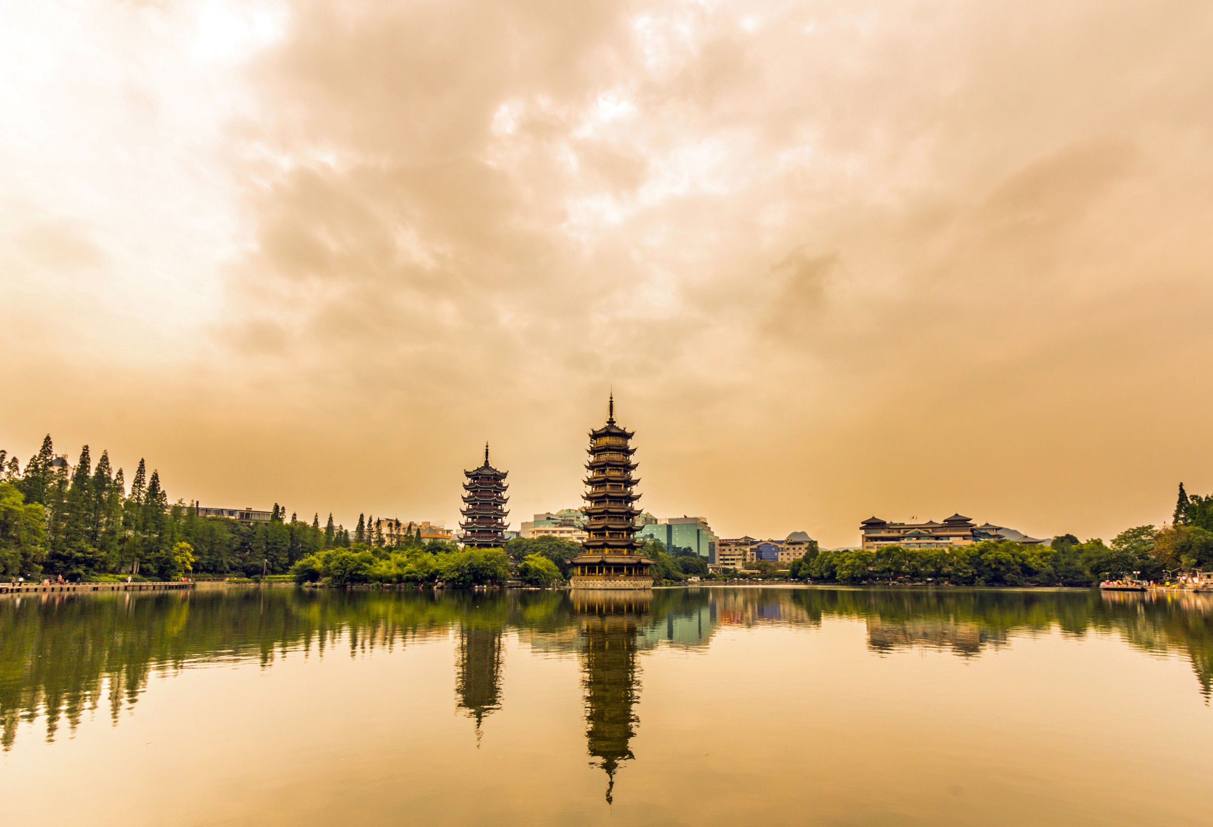 Sun and Moon Twin Pagodas at dusk in Guilin, China