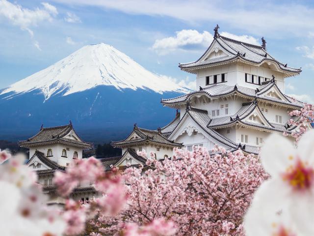 Japan_264 Cherry blossoms and castle in Himeji, Japan. Himeji Castle with beautiful cherry blossom in spring season. ฮิเมจิ ประเทศญี่ปุ่น ณ ปราสาทฮิเมจิในฤดูใบไม้ผลิ Date: 2/21/2024 Cherry blossoms and castle in Himeji, Japan.