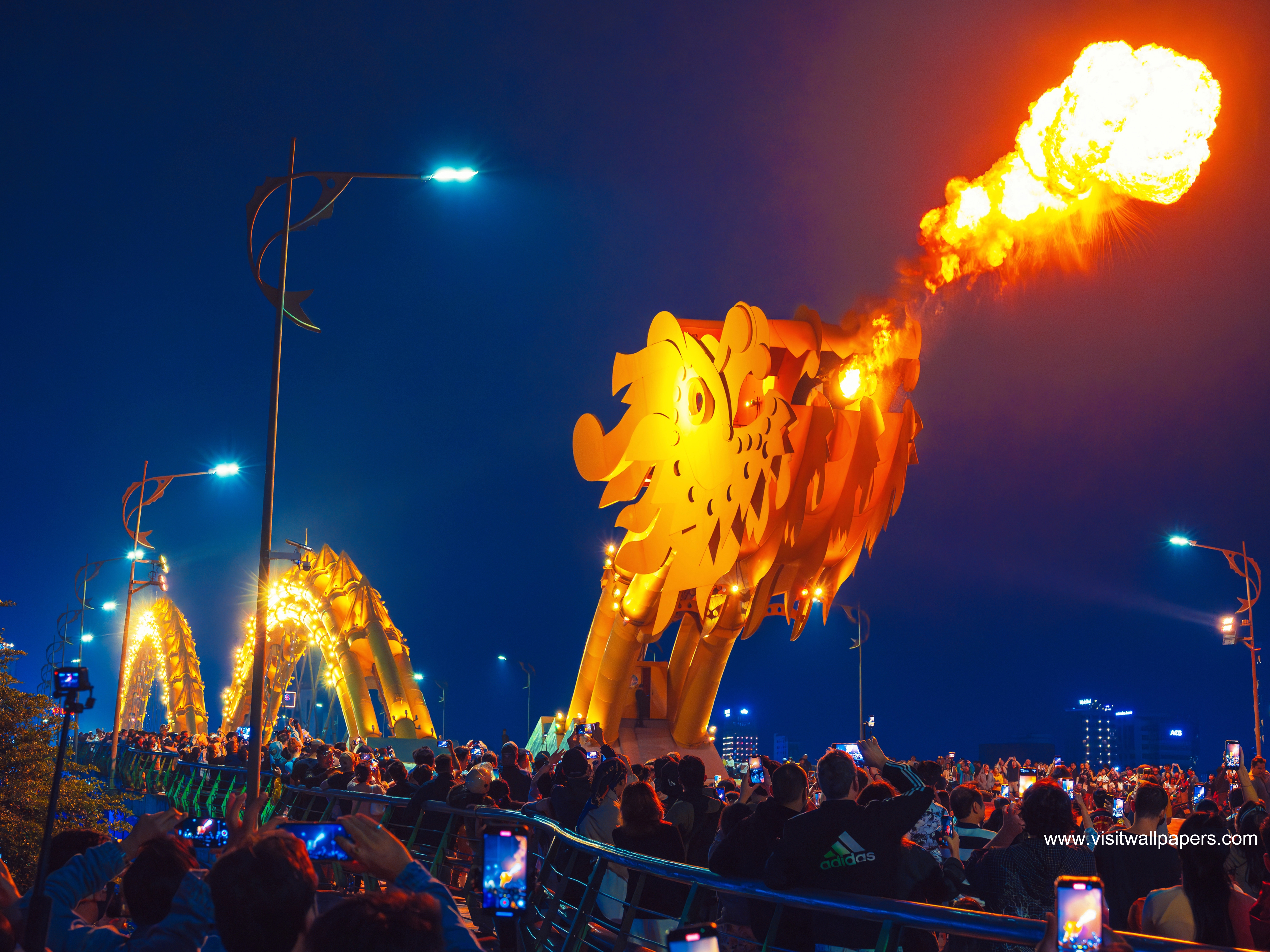 This modern bridge crosses the Han River at the Le Dinh Duong/Bach Dang traffic circle, providing the shortest road link from the Da Nang International Airport to other main roads in Da Nang city, and a more direct route to My Khe Beach and Non Nuoc Beach on the eastern edge of the city. The bridge was designed and built in the shape of a dragon and to breathe fire and water each Saturday and Sunday night at 9 pm.