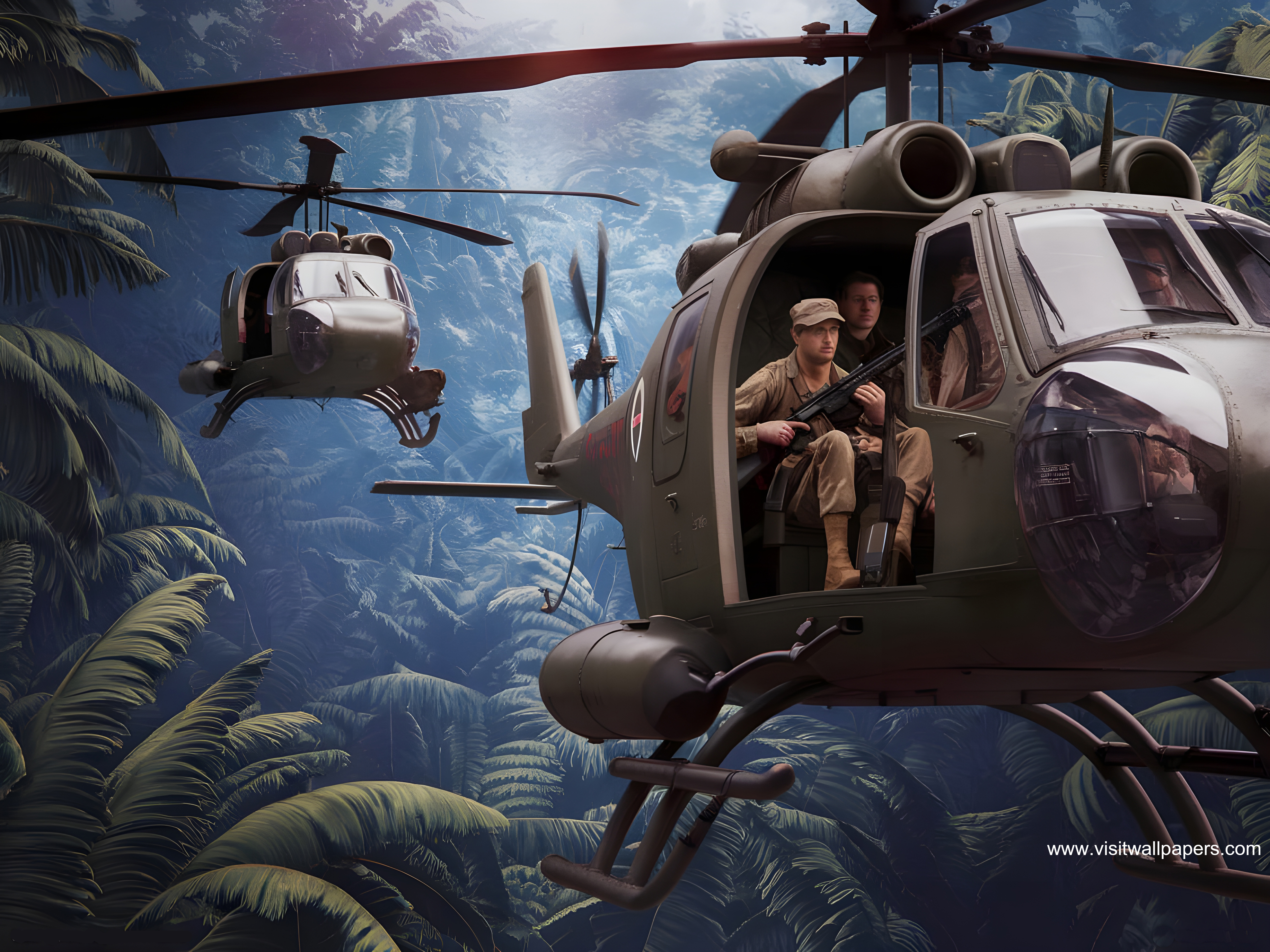 Helicopters on the background of the jungle of Vietnam. Vietnam war.The Vietnam War (1 November 1955 – 30 April 1975) was an armed conflict in Vietnam, Laos, and Cambodia fought between North Vietnam (Democratic Republic of Vietnam) and South Vietnam