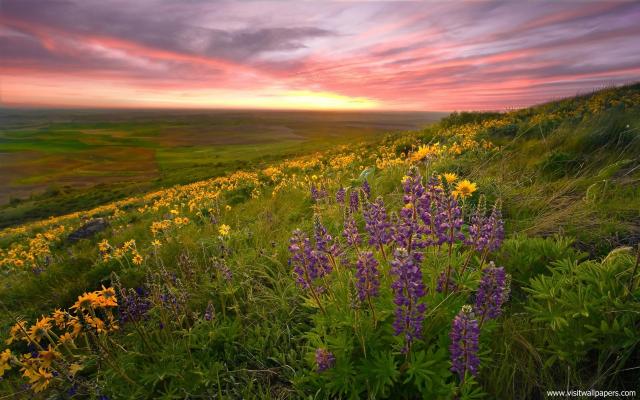 Nature_340Wonderful nature of Iceland. Icelandic violet blooming flowers (Lupins) in scenic view with mountains, waterfall and colorful sky on background. typical image of Iceland