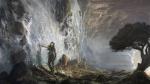Fantasy_402a warrior standing at the abandoned port and looking at the broken giant sword, digital art style, illustration painting