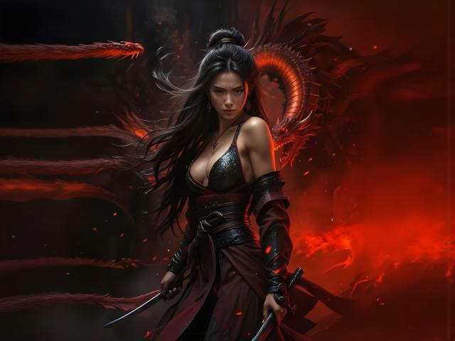 Fantasy_448A samurai woman with long hair, wearing an ancient Japanese costume, Her body is toned and lithe, and holding a sword in her hand in a dynamic pose, is surrounded by a background of a dragon pattern. the color scheme is dark red.