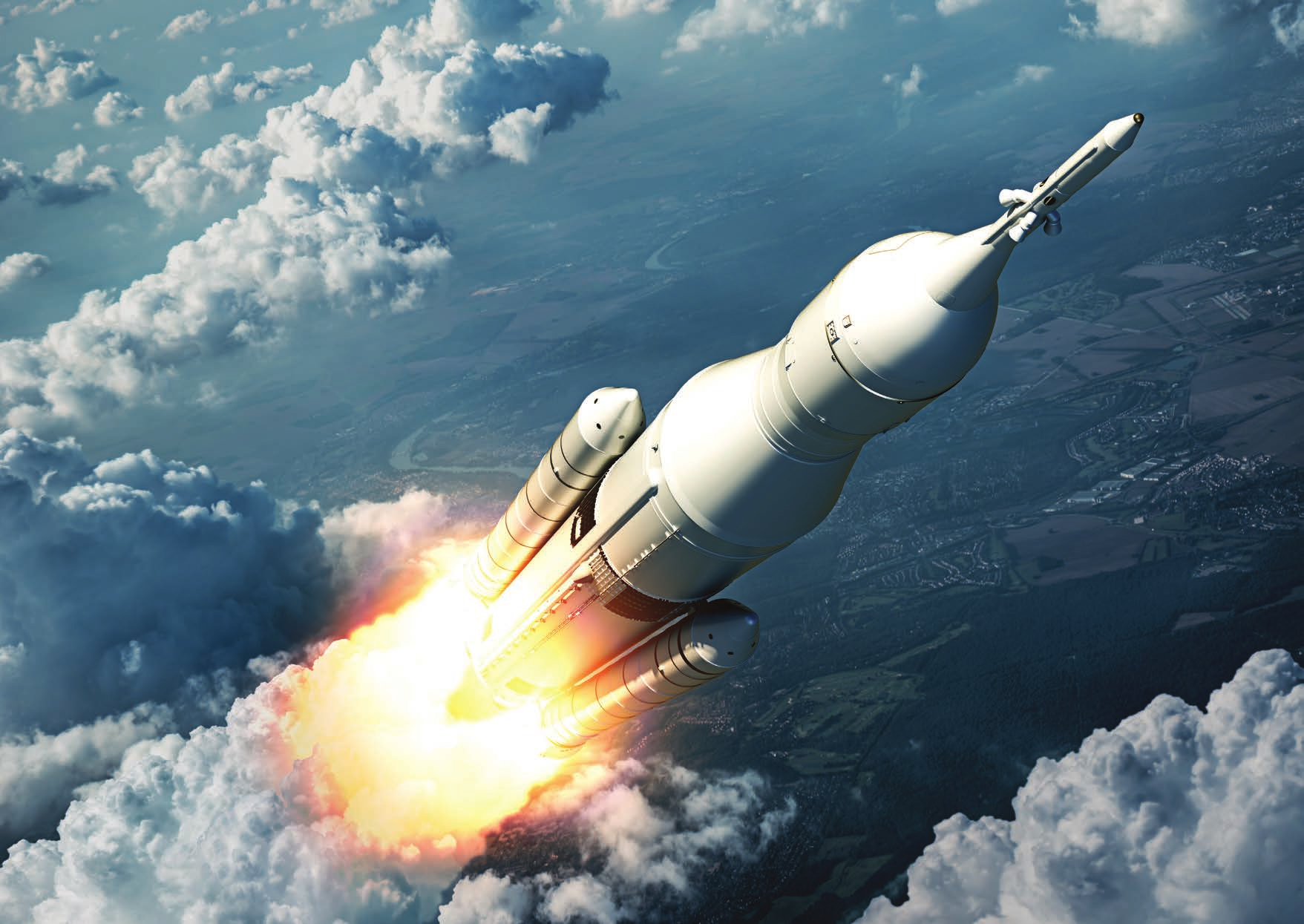 sci-fi_100Space Launch System Flying Over The Clouds. 3D Scene.
