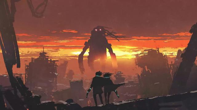 sci-fi scene of couple holding gun looking at giant robot standing in destroyed city, digital art style, illustration painting