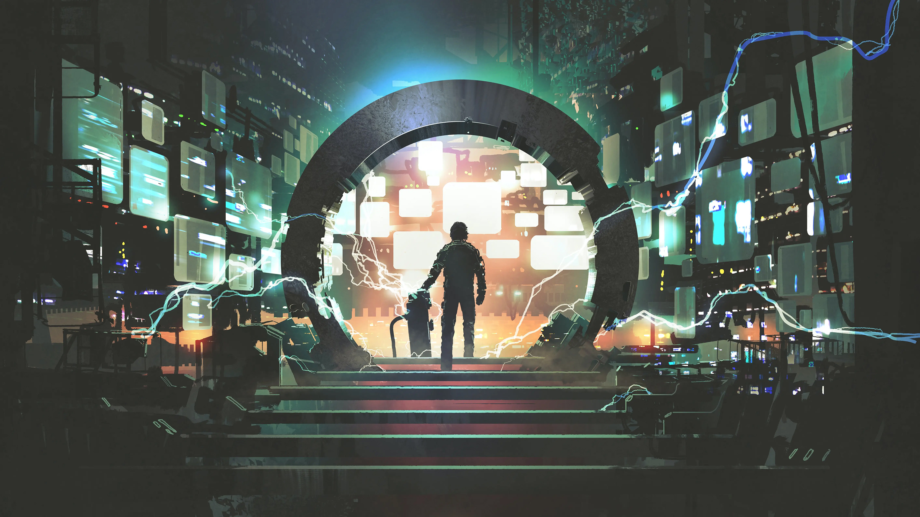 sci-fi concept showing a man standing at the futuristic portal, digital art style, illustration painting