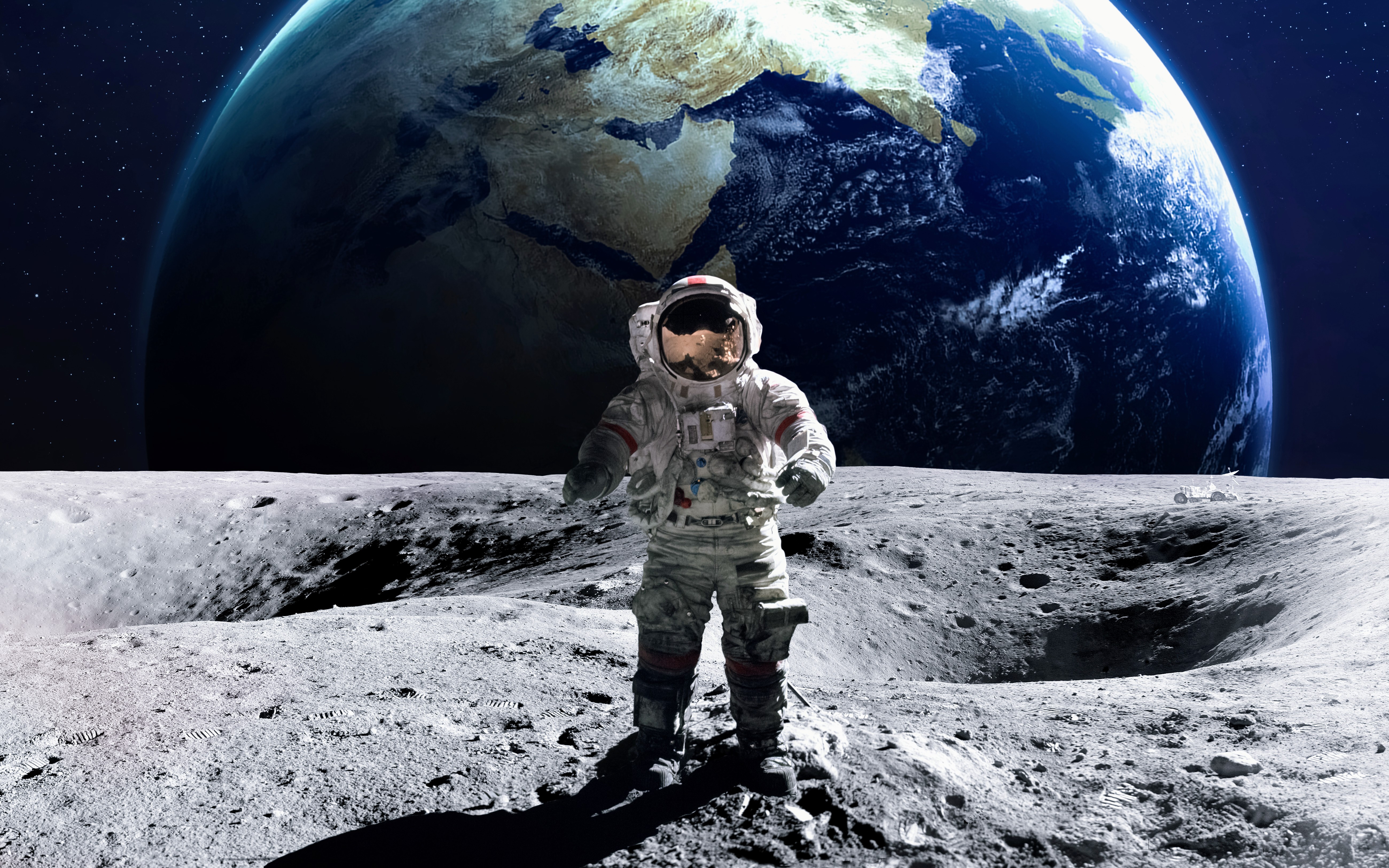 sci-fi_153Abstract photo art with astronaut on the Moon surface against Earth on the background, Exploring space and other planets.