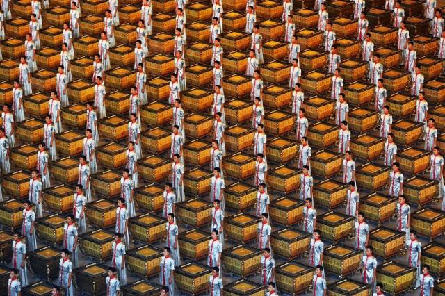 The giant scroll was then moved aside to show a fluid array of 897 movable type blocks that formed three variations of the character 和 (harmony), representing the third great Chinese invention: the movable type press. The character was shown, consecutively, in Bronze inscription, Seal script and modern Songti kaishu (Modern Chinese Script). 810 Han Dynasty-era performers representing the 3000 Disciples of Confucius, wearing feathered headgears and carrying bamboo slips, recited excerpts from the Analects: "Isn't it great to have friends coming from afar?" and "All men are brothers within the four seas."
