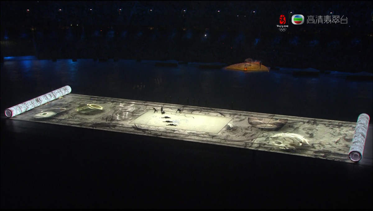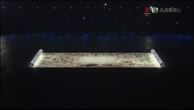 ม้วนกระดาษขนาดใหญ่ปรากฏกลางสนามพร้อมกับคลี่ออกอย่างช้าๆ และฉายภาพเครื่องถ้วยโบราณของจีน ส่วนตรงกลางของม้วนกระดาษเป็นผืนผ้าใบซึ่งมีนักแสดงที่แต่งชุดดำและทาหมึกไว้ทั่วตัวกลิ้งตัวไปมาเป็นรูปท้องฟ้า ภูเขา และดวงอาทิตย์ สื่อให้เห็นถึงการเขียนภาพด้วยหมึกจีน